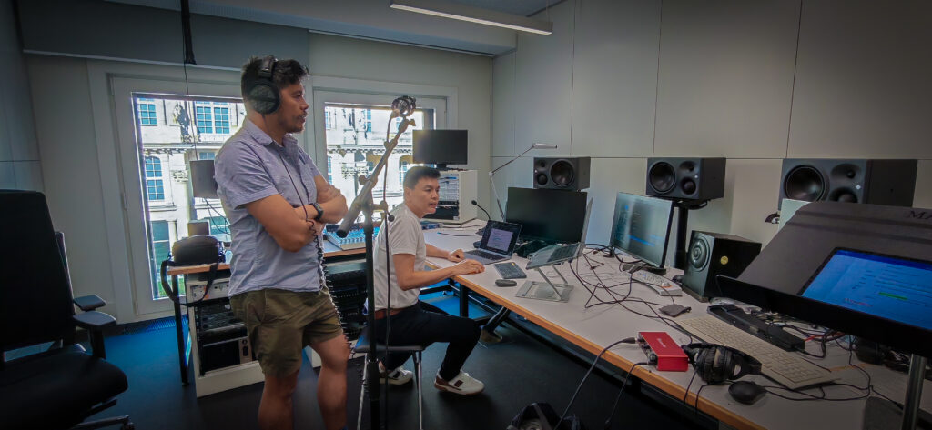 Jay’s arrival changed the rhythm of the work. He arrived from the Quezon City carrying Curly Tops chocolates, small sweets that carried childhood memories to Berlin. More importantly, he brought his dramaturgical eye and his sharp ear for my voice. Together we recorded new narrations at Humboldt Forum, with him sitting behind the console directing me. It was a shift in roles—I was no longer the engineer but the speaker, no longer holding the frame but inhabiting it. Jay knew my rhythms well enough to be precise, even strict: adjusting my octave, controlling my breath, pushing me to sustain energy when exhaustion set in. His direction gave the narration shape, but also reminded me how much of this project is carried not only by sound material but by trust and collaboration.